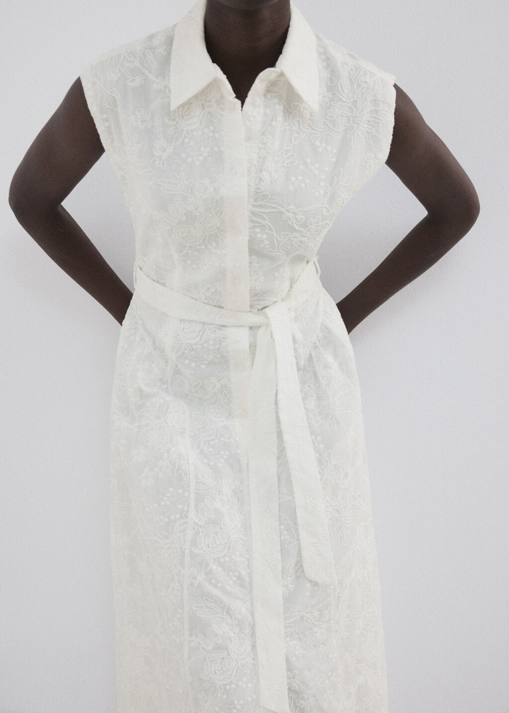 100% cotton fabric. Embroidered floral design. A-line silhouette. Shirt collar. Length Midi. Button up. Nightgown-style belt. 100% cotton lining