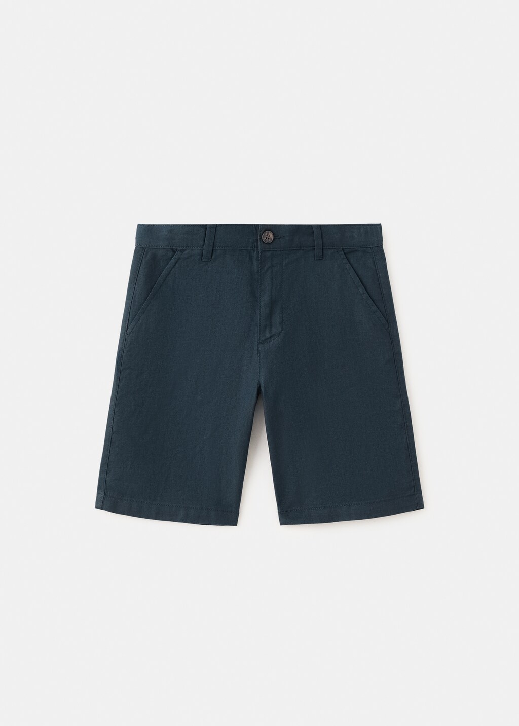 Linen and cotton blend fabric. Straight design. Short design. Belt loops. Two side pockets. Two rear patch pockets. Button and zip fastening.