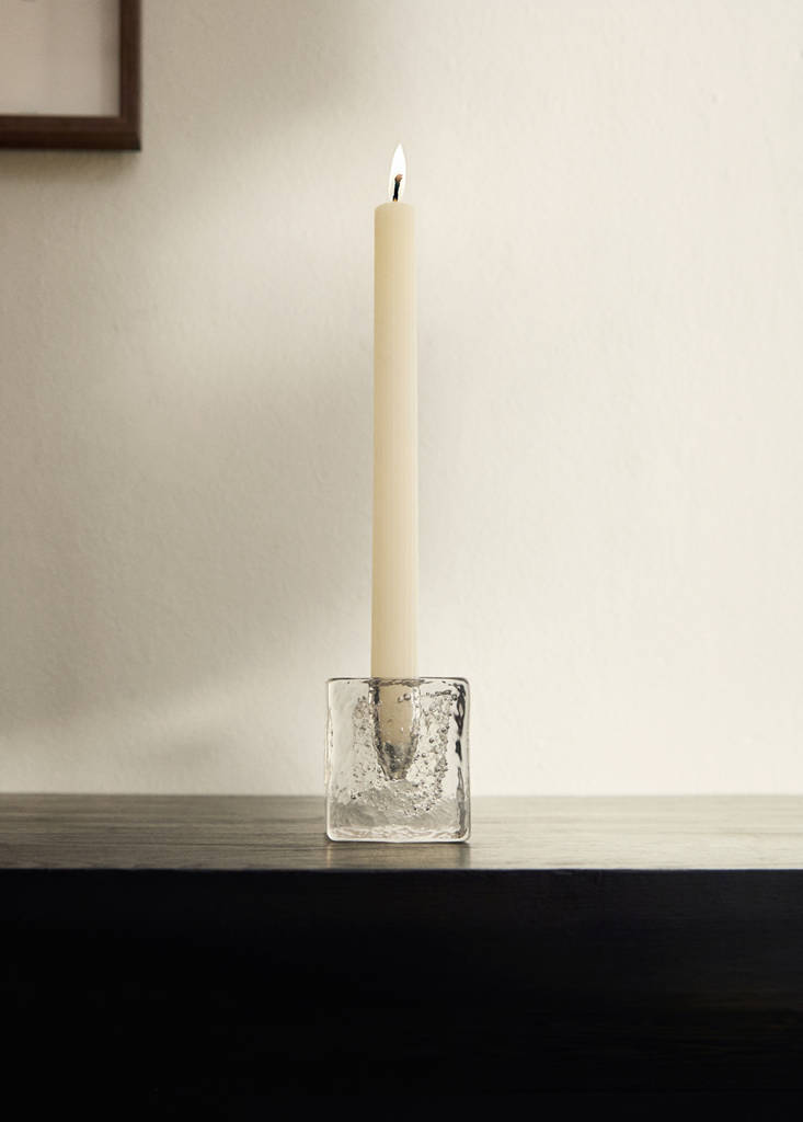 100% glass. Bubble effect. Square-shaped. Designed to hold a single candle. Coordinates with more products from the collection