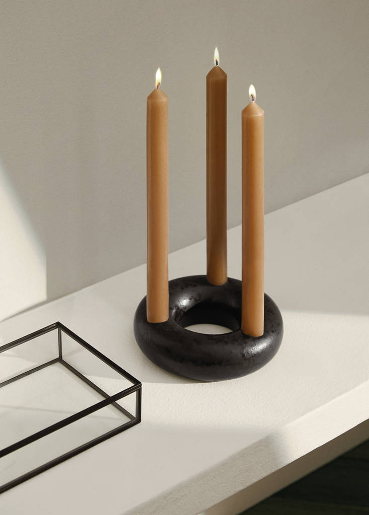 Round stoneware chandelierCurrent price [€ 19,99 ]€ 19,99Select a colourBlackSelect your sizeOne sizeAddAdd to your wishlistSee lookFree delivery to storeDiameter 5 cm. Height 5cm. 100% stoneware. Modern and durable design. Round shaped. Design with three holes in the base for candles. Available in two coloursDetails, composition and careStore availability