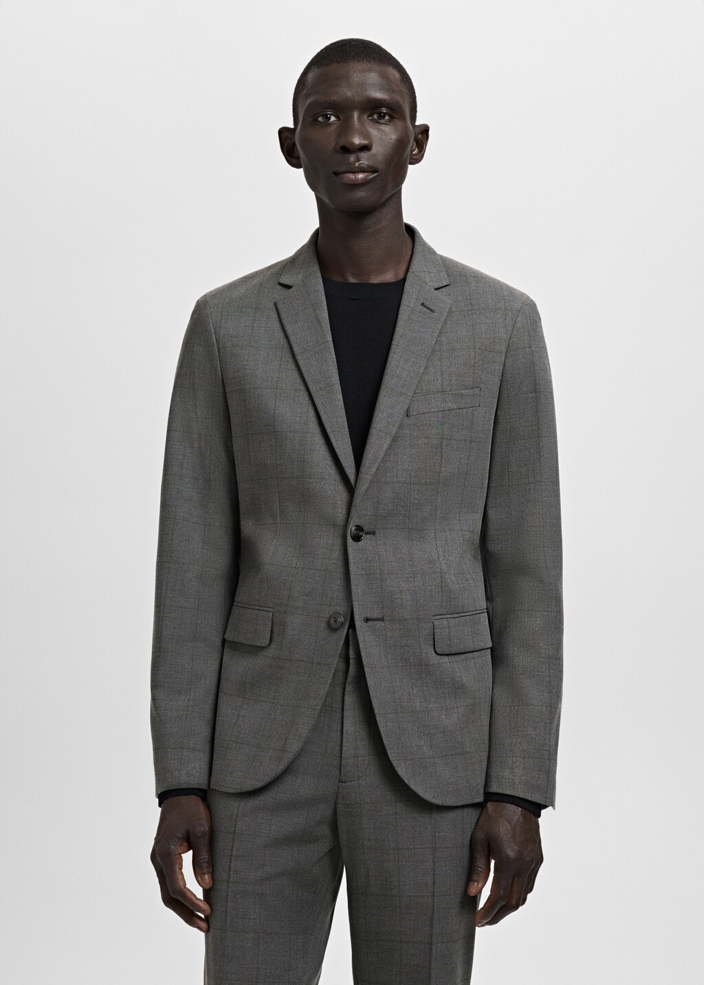 Super slim fit. Notch lapels and buttonhole. Chest welt pocket. Two pockets with flaps on the front. Interior pocket. Inner lining. Long sleeves with buttoned strip cuffs.