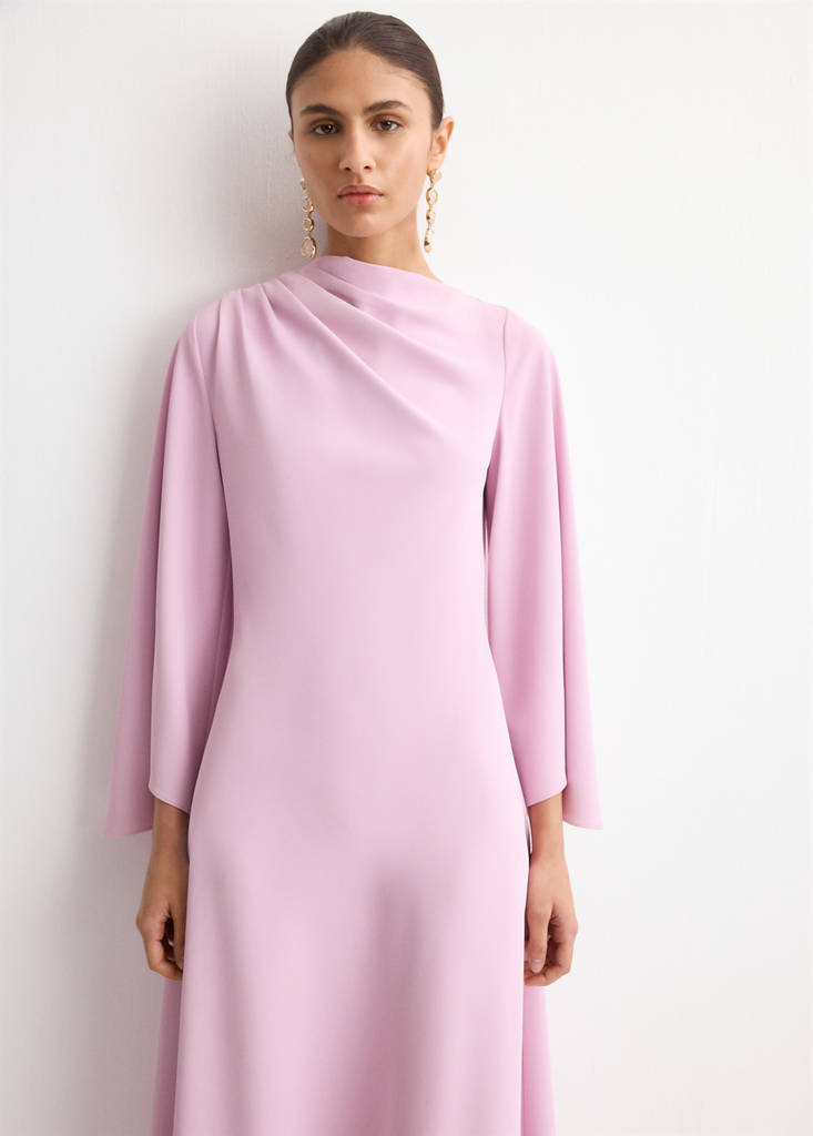 Satin fabric. Midi design. A-line design. Draped neckline. Flared sleeve. Side zip closure