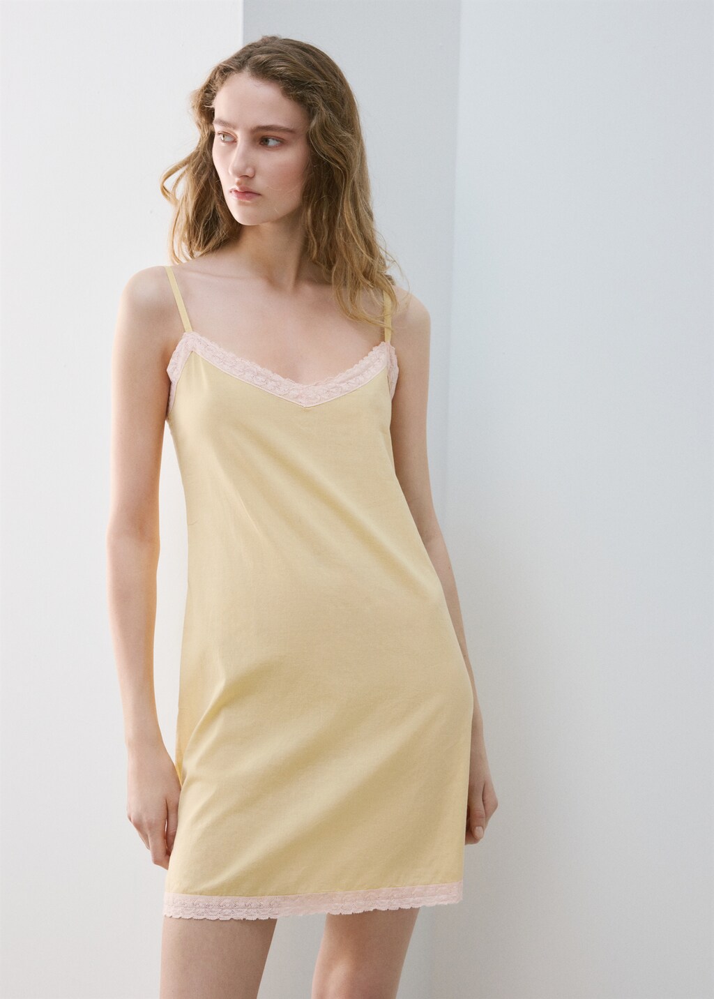 Short nightdress 100% cottonCurrent price [€ 39.99 ]€ 39.99Select a colourPastel YellowThe model is wearing size S and is 178cm tall.Select your sizeSMLSize guideAddAdd to your wishlistSee lookFree delivery to storeSee availability in storeDescription100% cotton fabric. Plain design. Embroidery Neck Detail. Thin straps. Cushion cover with embroidered details.See detailsShare