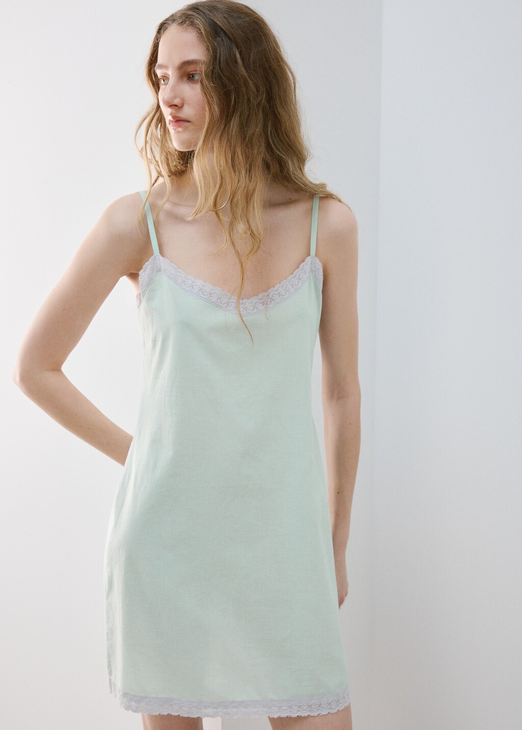 Short nightdress 100% cottonCurrent price [€ 39.99 ]€ 39.99Select a colourBlueThe model is wearing size S and is 178cm tall.Select your sizeSNot available. I want it!MLSize guideAddAdd to your wishlistSee lookFree delivery to storeSee availability in storeDescription100% cotton fabric. Plain design. Embroidery Neck Detail. Thin straps. Cushion cover with embroidered details.See detailsShare