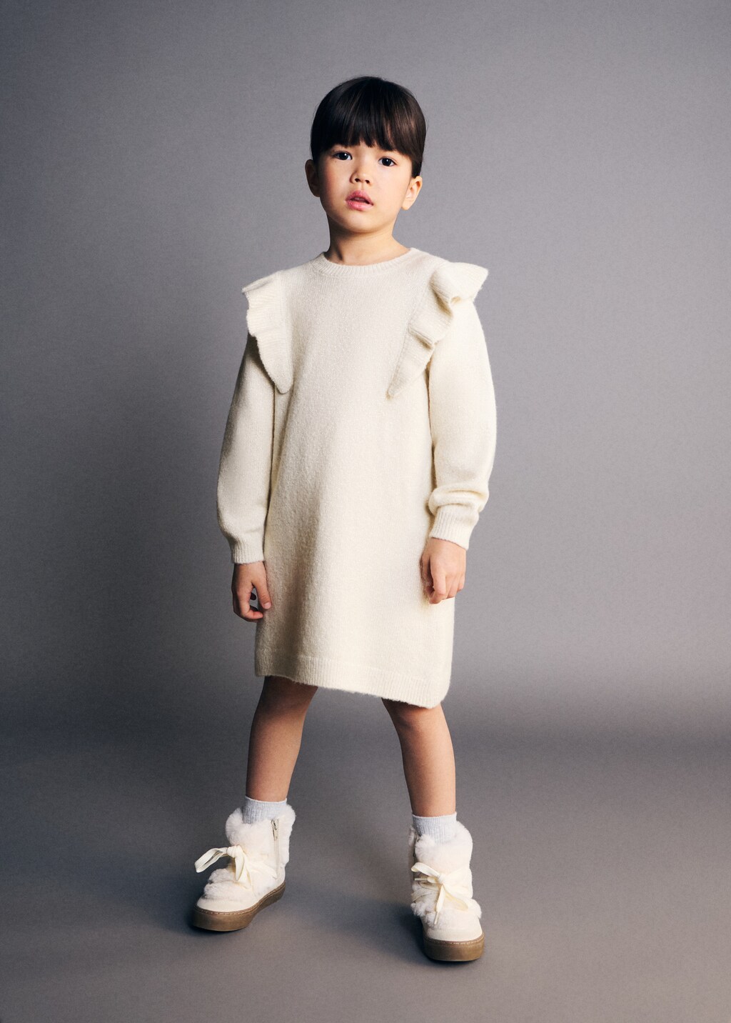 Gestrickter Stoff. Lurex-Gewebe. Gerades Design. Glitter-Design. Geknöpfter Rundhalsausschnitt. Lange Ärmel. Rüschen an den Schultern. Gerippter Kragen, Bündchen und Saum.
