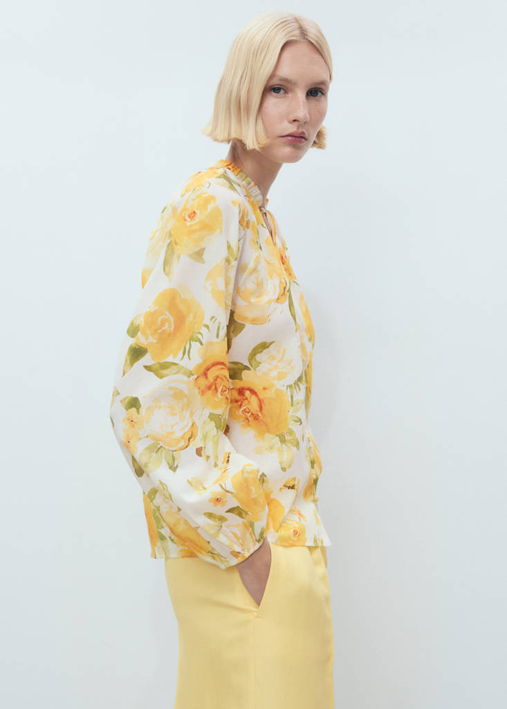 100% Baumwolle. Gerades Design. Halbtransparentes Design. Blumenmuster. Rundhalsausschnitt mit Kordel. V-Ausschnitt. Lange Ärmel. Puffärmel. Knopfverschluss vorne