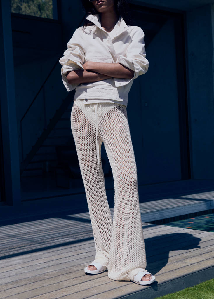 Grobstrickstoff. Häkelgewebe. Langes Design. Im Flared-Stil. Hohe Taille. Tunnelzug in der Taille. Total Look