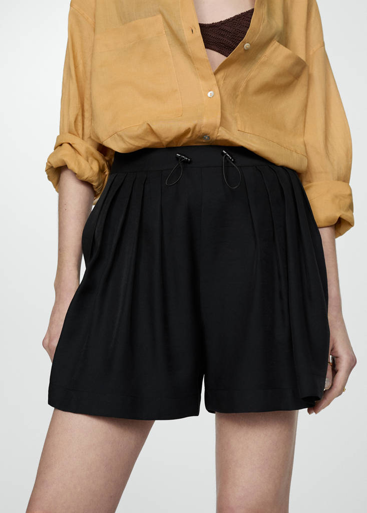 Fließender Stoff. Kurzes Design. Gerades Design. Plissiertes Design. Hohe Taille. Pattentasche hinten. Ohne Verschluss. Tunnelzug in der Taille. Total Look
