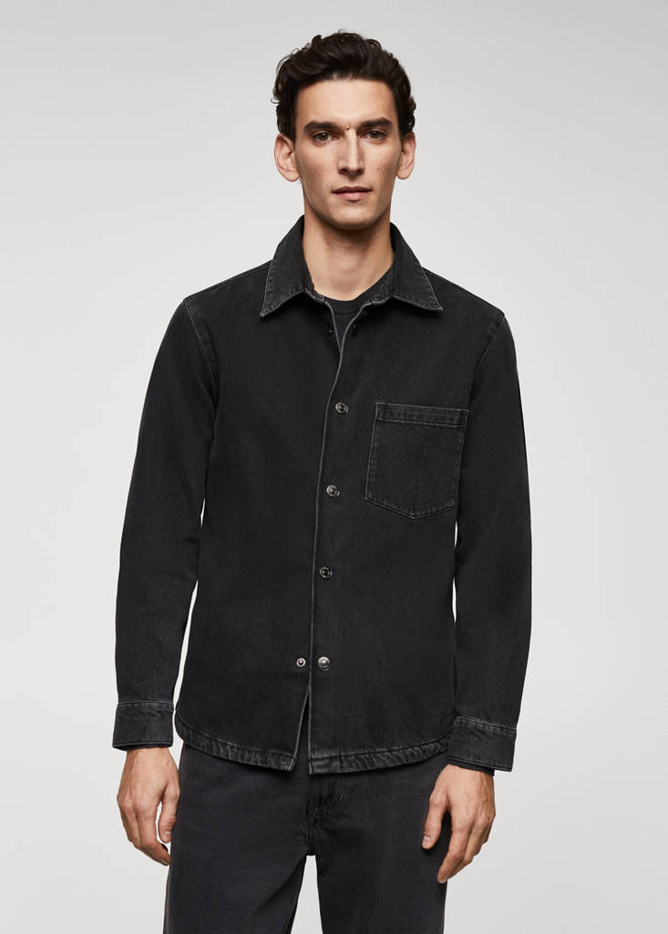 Slim Fit. 100 % Baumwolle. Baumwollstoff im Jeans-Stil. Dunkelgraue Waschung. Druckknopfverschluss vorne. Aufgesetzte Brusttasche. Regular Fit. Klassischer Kragen. Geknöpfter langer Ärmel. Abgerundeter Saum