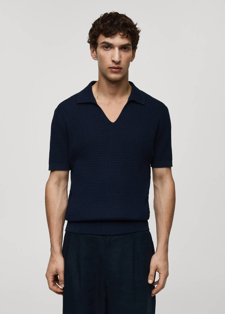 Feinstrick. Polo-Kragen mit V-Ausschnitt ohne Verschluss. Kurze Ärmel. Gerader Saum. 100% Baumwolle