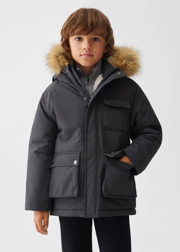 Basics-Kollektion. Gestepptes Design. Gerades Design. Kapuze. Kapuze mit Detail aus Kunstpelz. Zwei Vordertaschen. Lange Ärmel. Reißverschluss und Knopfverschluss