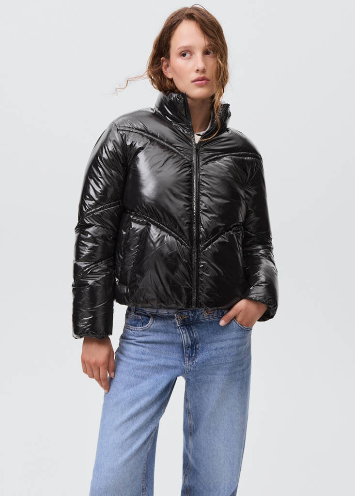 Steppstoff. Gewebe mit Glitzer-Detail. Gerades Design. Perkins-Kragen. Lange Ärmel. Reißverschluss. Zwei seitliche Taschen