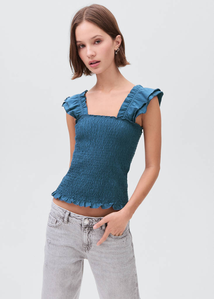 100% Baumwolle. Gerades Design. Elastisches Design. Gesmokter Einsatz. Gerafftes Panel. Rüschenträger
