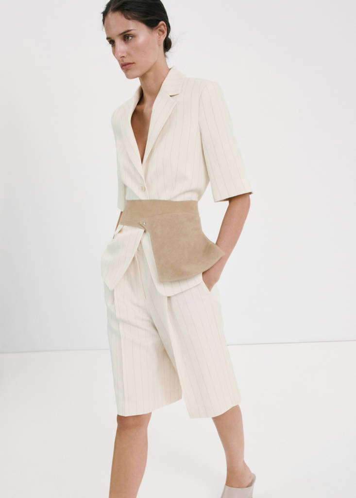 Tissu en lin mélangé. Coupe droite. Col en V avec rabat. Manches trois-quarts. Revers à encoche. Deux poches à rabat. Fermeture avant avec boutons. Détail ceinture à la taille. Total look