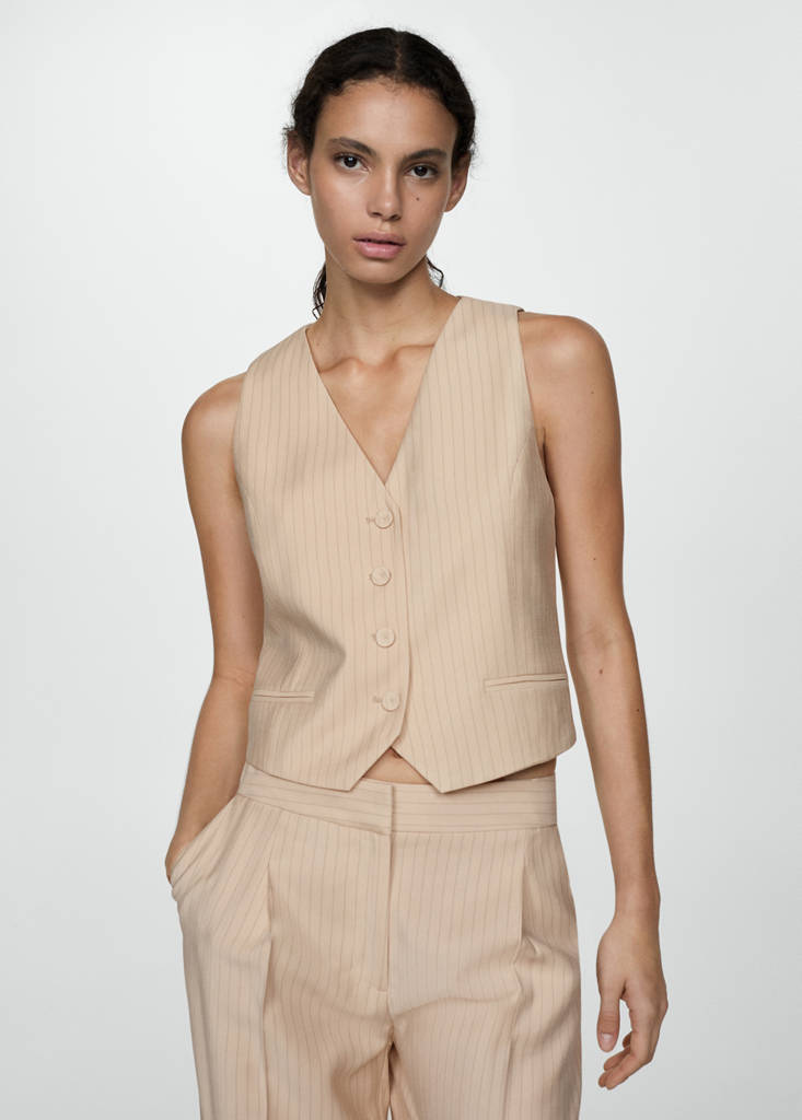 Style costume. Coupe droite. Deux poches passepoilées à l'avant. Encolure en V. Sans manches. Total look. Doublure. Motif rayé. Fermeture avant avec boutons