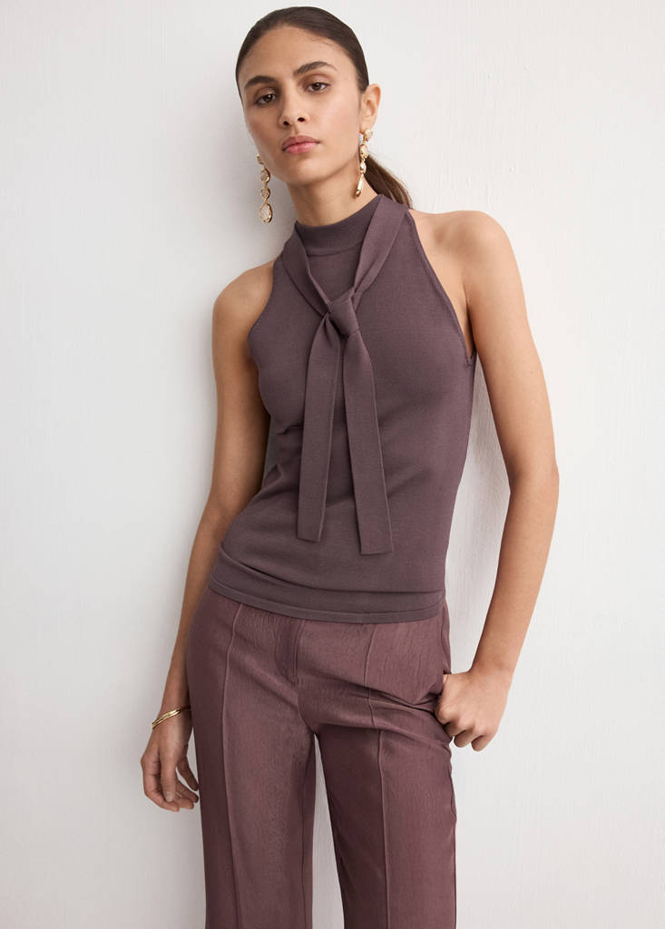 Maille. Coupe droite. Détail de nœud. Col halter. Design sans manches. Sans fermeture