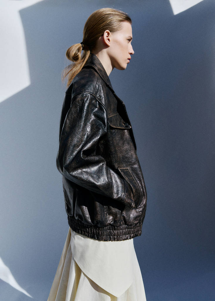 100 % cuir de bison. Cuir nappa. Style bomber. Design oversize. Col en V avec rabat. Revers à encoche. Manche longue. Panneau froncé à la taille. Deux poches à rabat sur la poitrine. Deux poches latérales passepoilées. Fermeture avant avec boutons. Doublure intérieure. Exclusivité Internet. Collection Selection