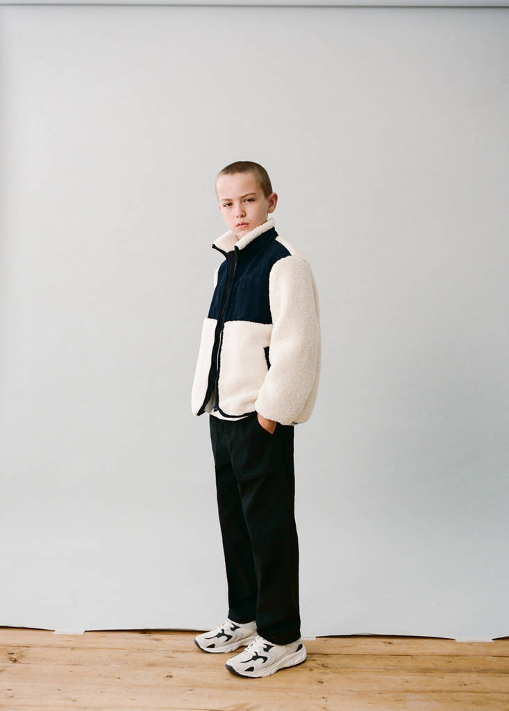 Tissu polyester. Tissu en sherpa. Doublure matelassée. Col Perkins. Manche longue. Fermeture Éclair à l’avant. Deux poches latérales