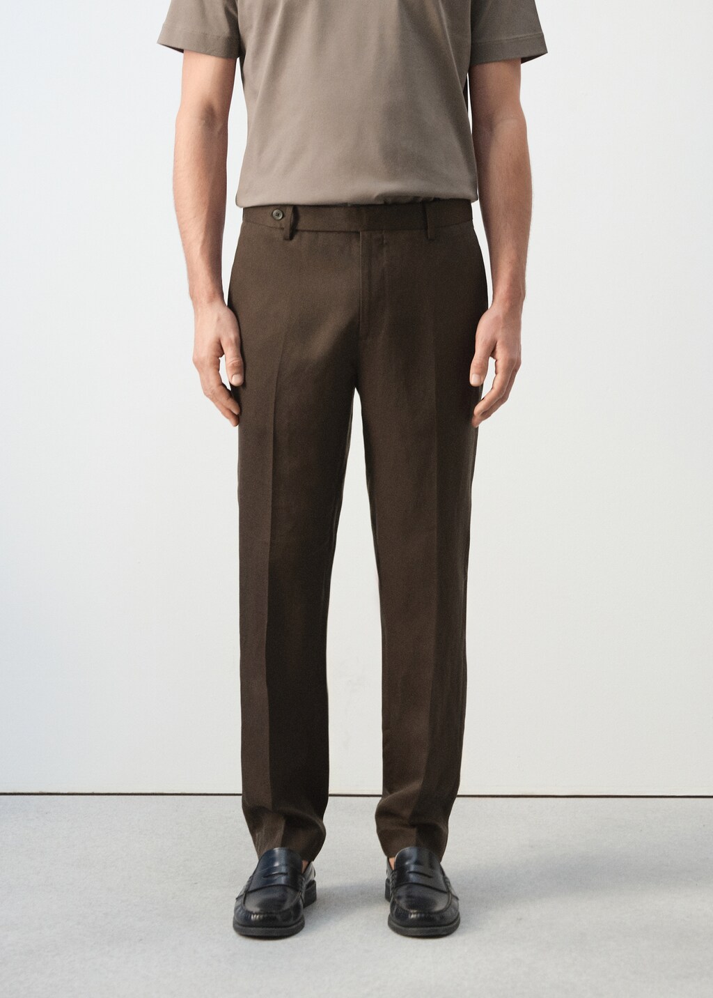 ESSENTIALS: Conçus pour durer. Les couleurs blanc et chocolat sont exclusives en ligne. Slim fit. Longueur standard. Passants pour ceinture. Taille à boutonnage croisé. Fermeture à boutons, agrafe et fermeture Éclair. Deux poches passepoilées latérales. Deux poches à rabat et bouton à l'arrière. Détail de pli marqué à l'avant et à l'arrière.