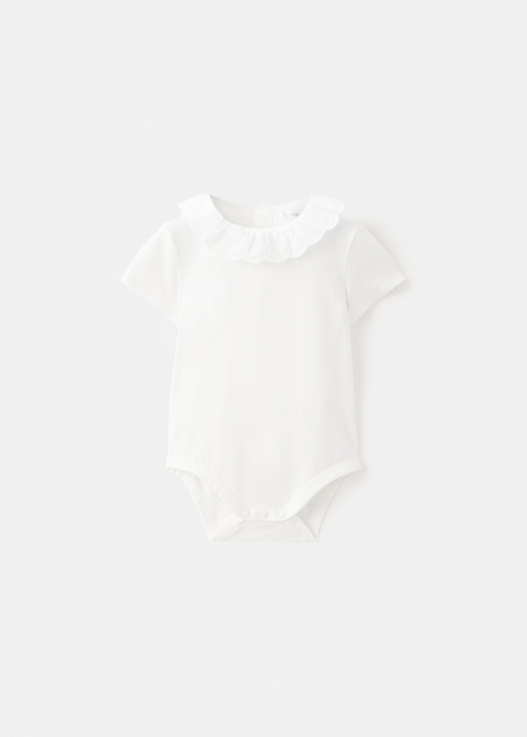 Tissu en coton. Design body. Col babydoll. Col brodé. Détail de volants sur le col. Manche courte. Fermeture métallique à bouton-pression sur le bas.