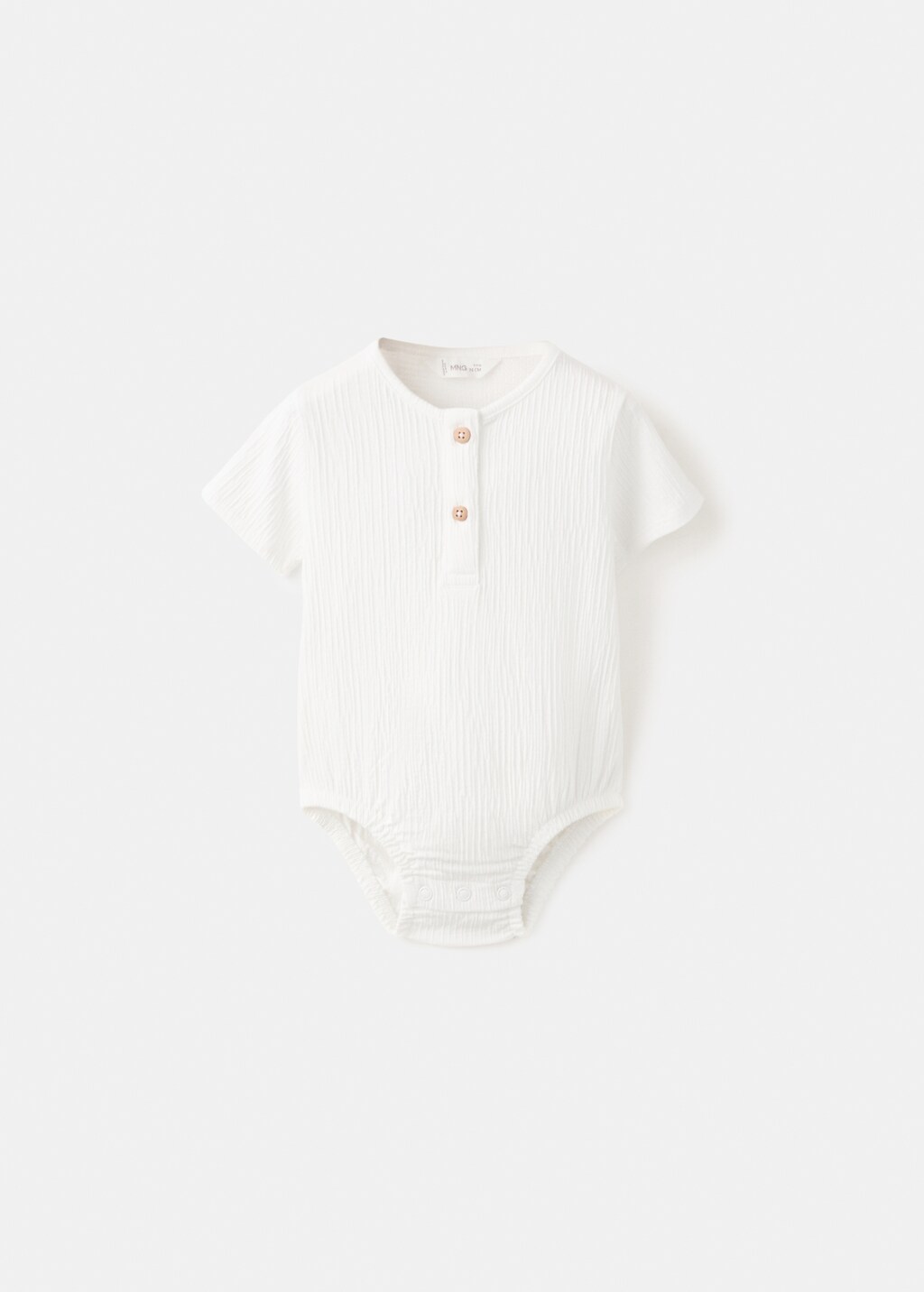 Confectionné dans un tissu en coton texturé, ce body présente des manches courtes et un col rond avec fermeture boutonnée. Il inclut une fermeture pratique à boutons-pression pour plus de confort