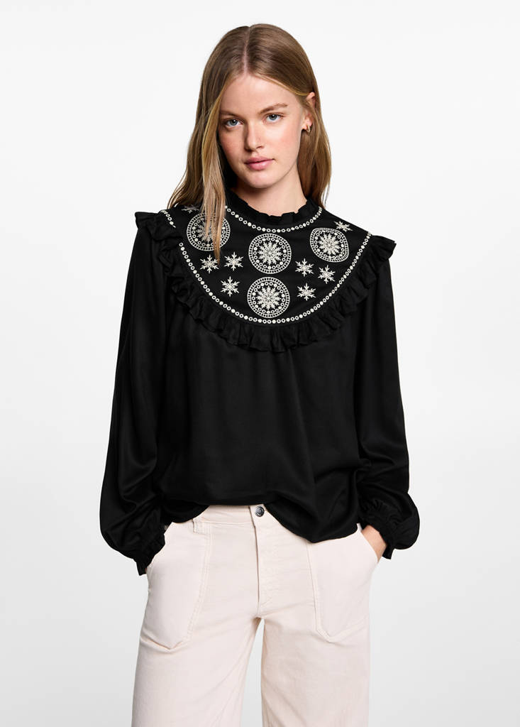 Tissu fluide. Coupe droite. Col rond. Détails brodés. Manche longue. Fermeture par bouton à l'arrière