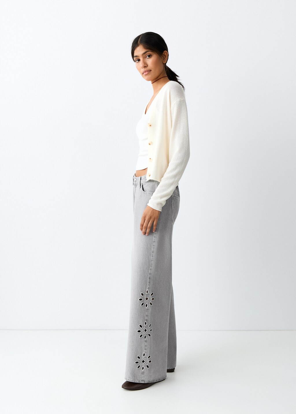 Tissu en coton style denim cowboy. Coupe droite. Design long. Taille Regular Waist. Passants pour ceinture. Cinq poches. Fermeture éclair et bouton. Détails brodés ajourés