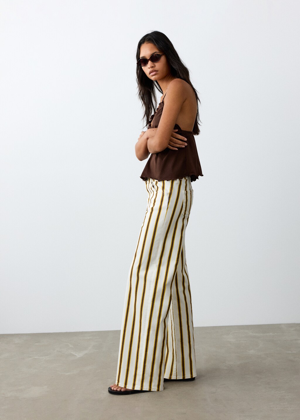 Tissu en coton style denim cowboy. Coupe droite. Design long. Imprimé à rayures en contraste. Taille basse. Passants pour ceinture. Deux poches. Poche gousset. Fermeture par bouton et zip.