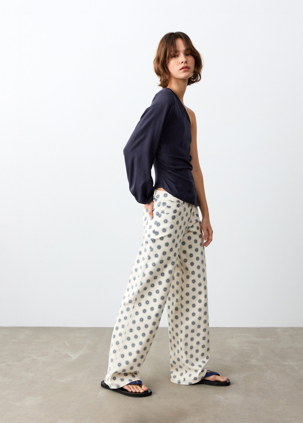 Tissu en coton style denim cowboy. Design wide leg. Design long. Motif imprimé. Taille Regular Waist. Passants pour ceinture. Fermeture par bouton et zip.