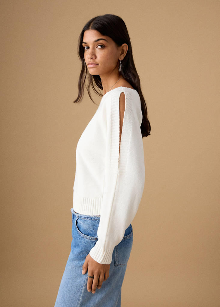 Tissu en maille. Design uni. Col bateau. Manche longue. Manga avec découpe