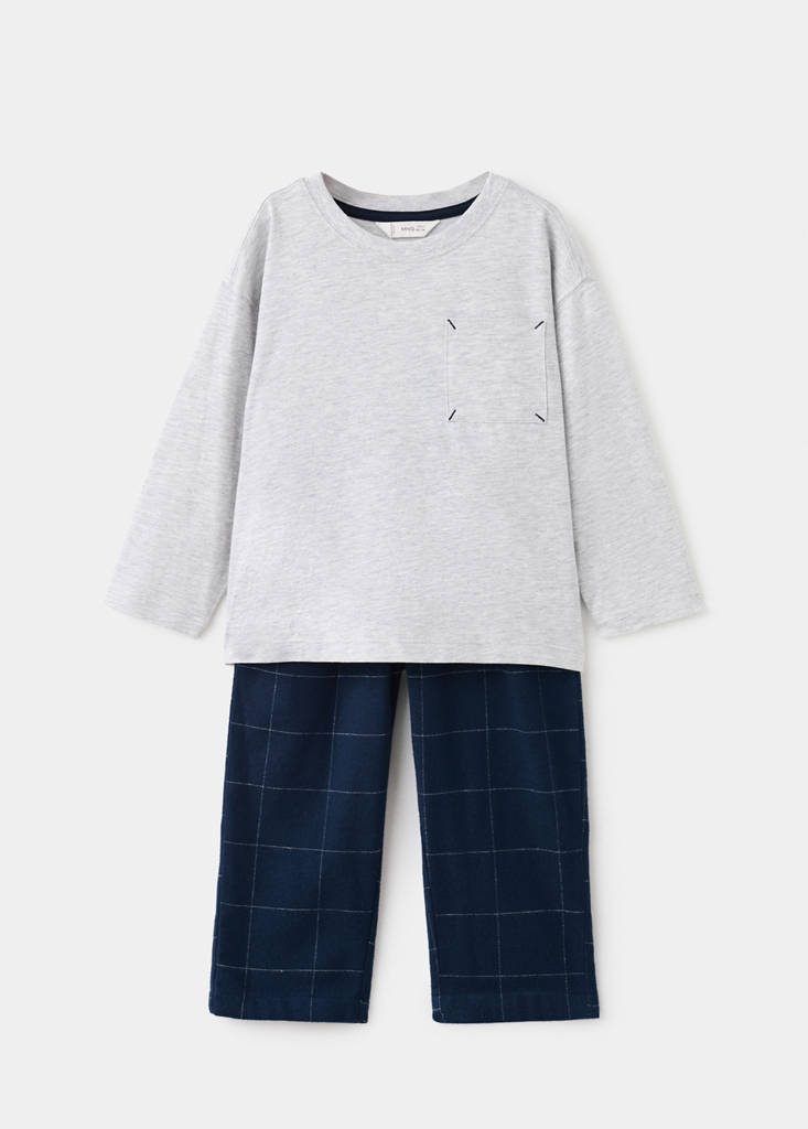 Long pyjama pack. Cotton fabric. Round neck. Long sleeves. Patch pocket on the chest. Gingham check long trousers. Elastic waist with drawstring