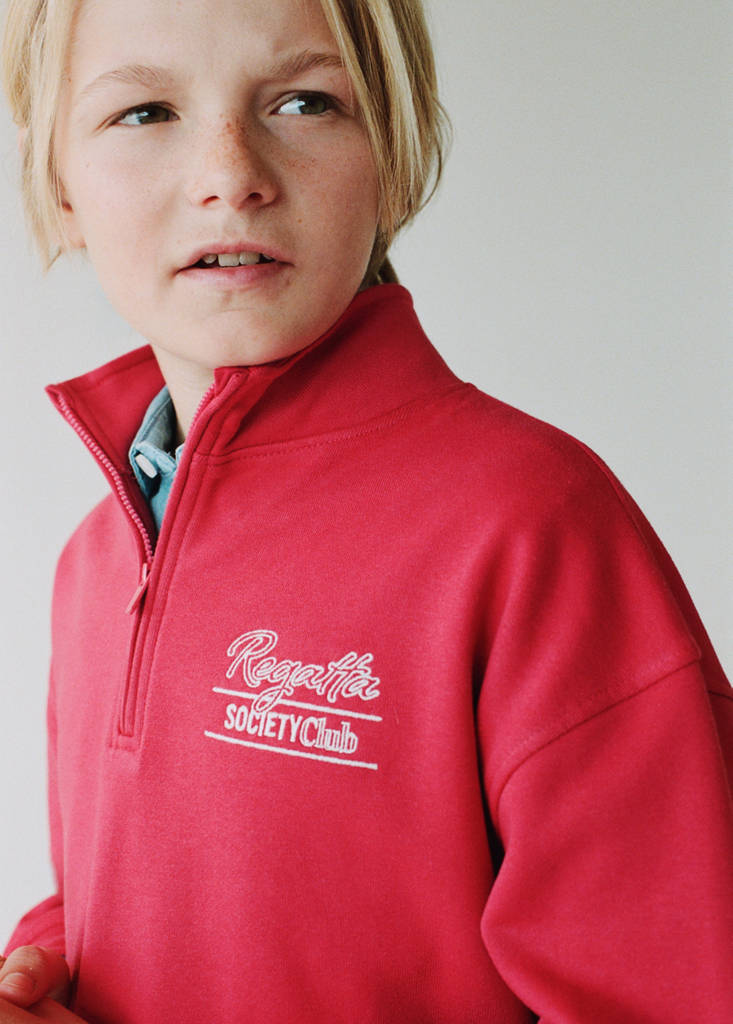 Crafted from cotton fabric, this garment features a straight design with a funnel neck and long sleeves. It stands out for the embroidered text on the chest and an embroidered message on the back.