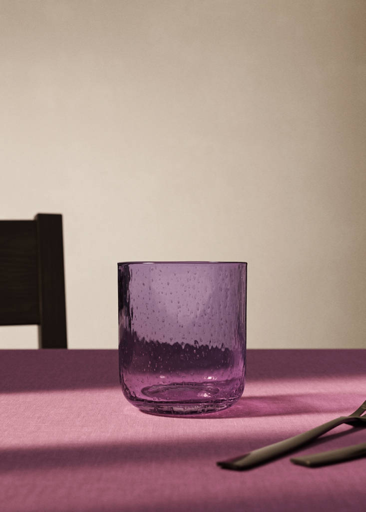 100% glass. Diameter: 8cm. Height: 9cm. Capacity: 240ml. These bubbles, of varying sizes, are distributed unevenly across the glass, creating a visually rich and complex texture. The shape of the glass, which evokes the silhouette of an elegantly truncated cylinder, offers a perfect balance between functionality and aesthetics. Coordinates with more products from the collection. Available in various colours that can be combined with each other. Dishwasher safe. Microwave safe