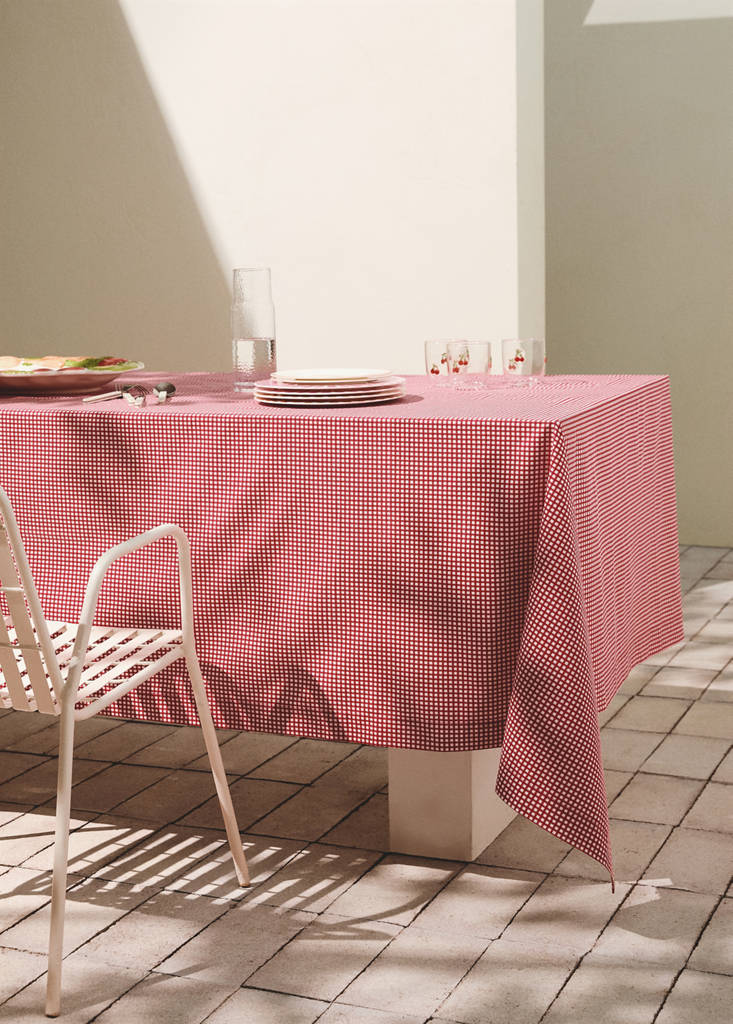 Vichy check cotton tablecloth for 8 to 10 guestsCurrent price [€ 69,99 ]€ 69,99Select a colourRedSelect your size150x250cm150x350cmSizeChoose your sizeAddAdd to your wishlistSee lookFree delivery to store100% cotton fabric. Size: 150x350 cm. Serves 8 to 10 people. Vichy check pattern. Ideal for terraces and al fresco diningDetails, composition and careStore availability