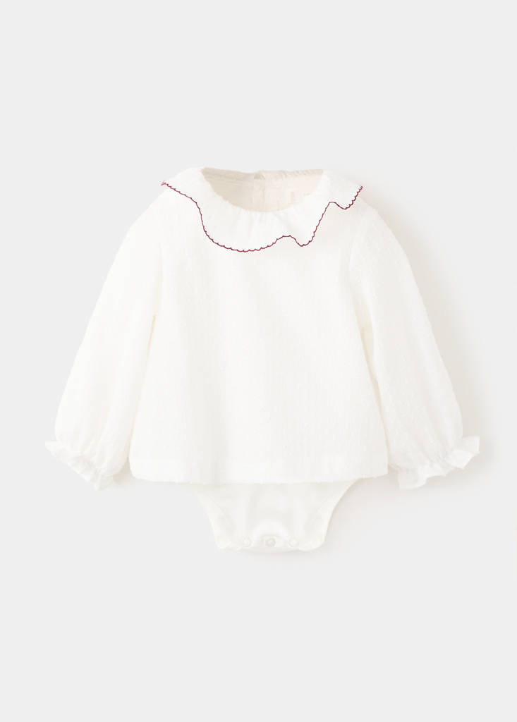 100% cotton fabric. Body design. Embroidered design. Peter Pan collar. Embroidery Neck Detail. Long sleeves with ribbed trims. Button fastening on the back section. Bottom opening with button fastening. Christmas Collection