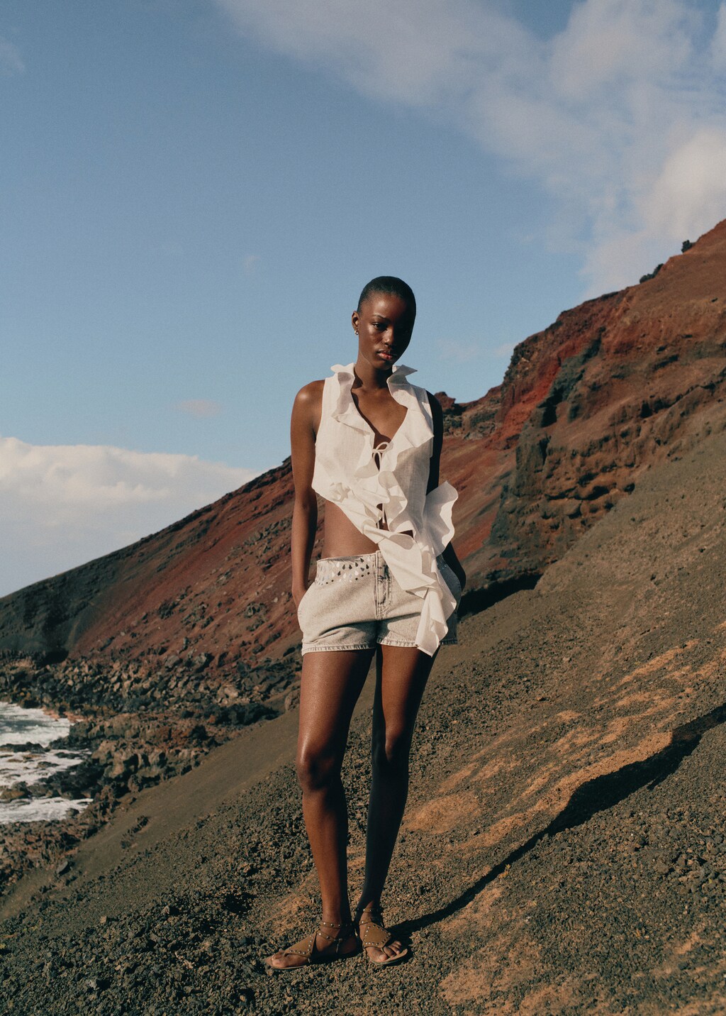 100% cotton fabric. V-neckline. Sleeveless. Bow detail on the neckline. Ruffle detail