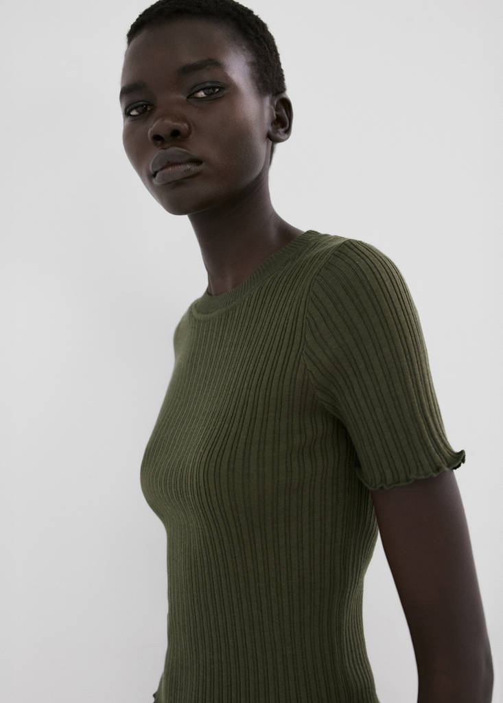 Ribbed knit t-shirtCurrent price [€ 35.99 ]€ 35.99Select a colourKhakiThe model is wearing size S and is 180cm tall.Select your sizeXSSMLXLDimensionsAddAdd to your wishlistSee lookFree delivery to storeCotton blend fabric. Cable knit cuff. Straight design. Round neck. Short sleeves. Frilled sleeves and hemDetails, composition and careStore availability