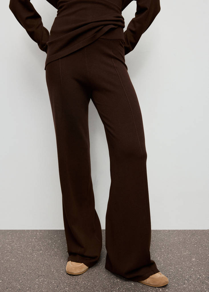 Knitted trousers with stitching detailCurrent price [€ 39,99 ]€ 39,99Select a colourChocolateThe model is wearing size S and is 173cm tall.Select your sizeXXSNot available. I want it!XSNot available. I want it!SNot available. I want it!MNot available. I want it!LNot available. I want it!XLNot available. I want it!XXLNot available. I want it!DimensionsNotify meAdd to WishlistSee lookFree delivery to storeKnitted fabric. Long design. Straight design. Mid-rise. Elasticated waistband. Seam detail. No Fastening. Total lookDetails, composition and careStore availability