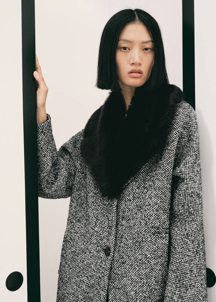 Marled wool-blend fabric. Long design. Straight design. Lapel-collar V-neck collar. Detachable fur-effect collar. Long sleeves. Front closure with buttons. Inner lining.