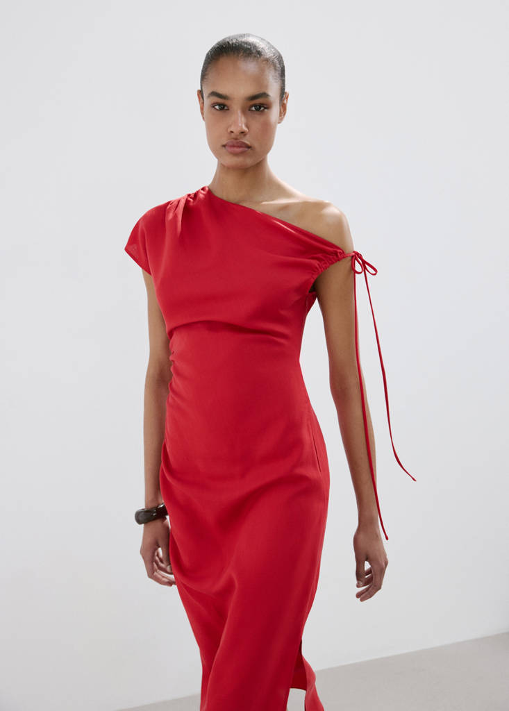 Linen and lyocell blend fabric. Midi design. Asymmetric design. Side ruffles. Short sleeves. Available Plus