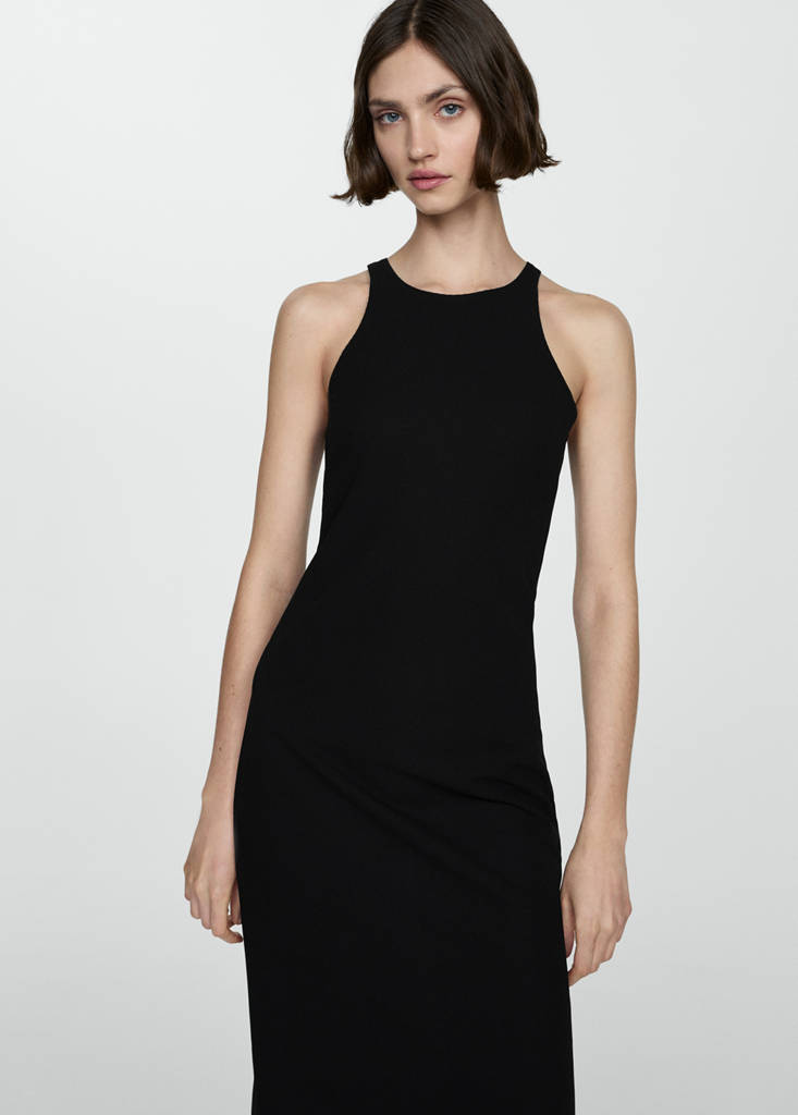 Fluid fabric. Midi design. Halter neck. Sleeveless. No Fastening. Side slit. Available Plus. Party, ceremony and communion collection. Fitted design