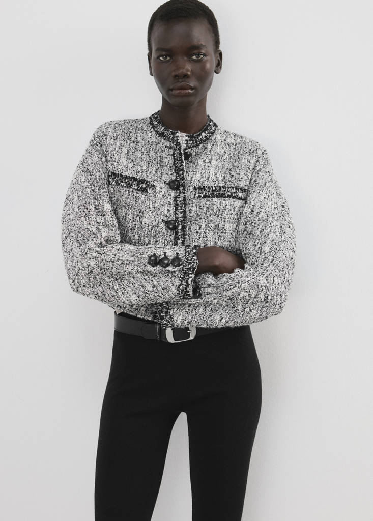 Tweed fabric. Straight design. Round neck. Long sleeves with buttoned cuffs. Frayed finish. Two front welt pockets. Button fastening at the front. Jewel-effect buttons. Inner lining
