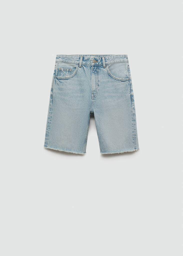 Denim-style cotton fabric. Mid-rise. Straight design. Two front pockets. Coin pocket. Two patch pockets at the back. Belt loops. Frayed hem. Festival Season. Front zip and button closure. Midi design. Zip and button fastening. Five pockets.