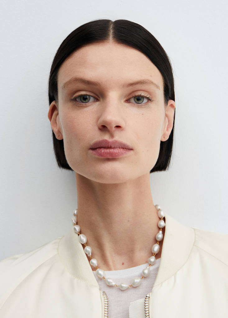 Coupe courte, ornement perlé, fermoir à chaînette et mousqueton.