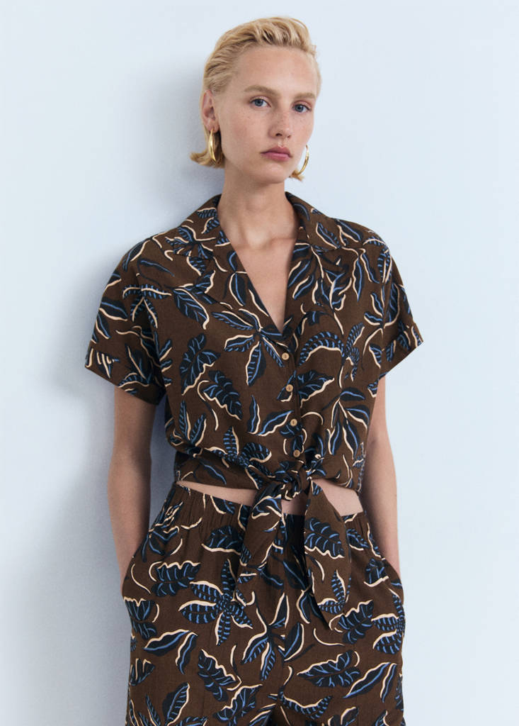 Coupe droite. Design crop. Imprimé. Col chemise. Manche courte. Détail de nœud à l'avant. Fermeture avant avec boutons. Disponible en grande taille