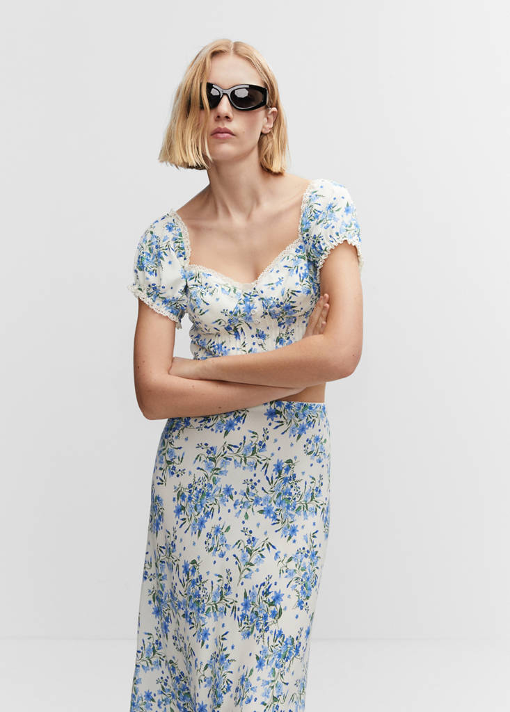Tissu fluide. Coupe cintrée. Style crop. Imprimé floral. Encolure en cœur. Manches courtes bouffantes. Sans fermeture. Boutons décoratifs. Détails brodés. Total look