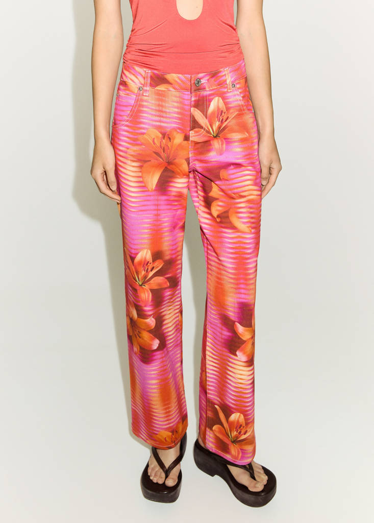 Tissu en coton style denim cowboy. Taille mi-haute. Design long. Design wideleg. Motif à rayures. Imprimé fleuri. Deux poches avant. Poche gousset. Deux poches plaquées à l'arrière. Passants de ceinture. Fermeture éclair et bouton. Motif imprimé.