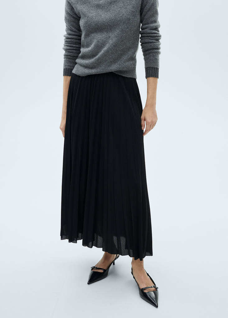Tissu fluide. Design long. Design plissé. Design évasé. Taille mi-haute. Taille élastiquée. Sans fermeture