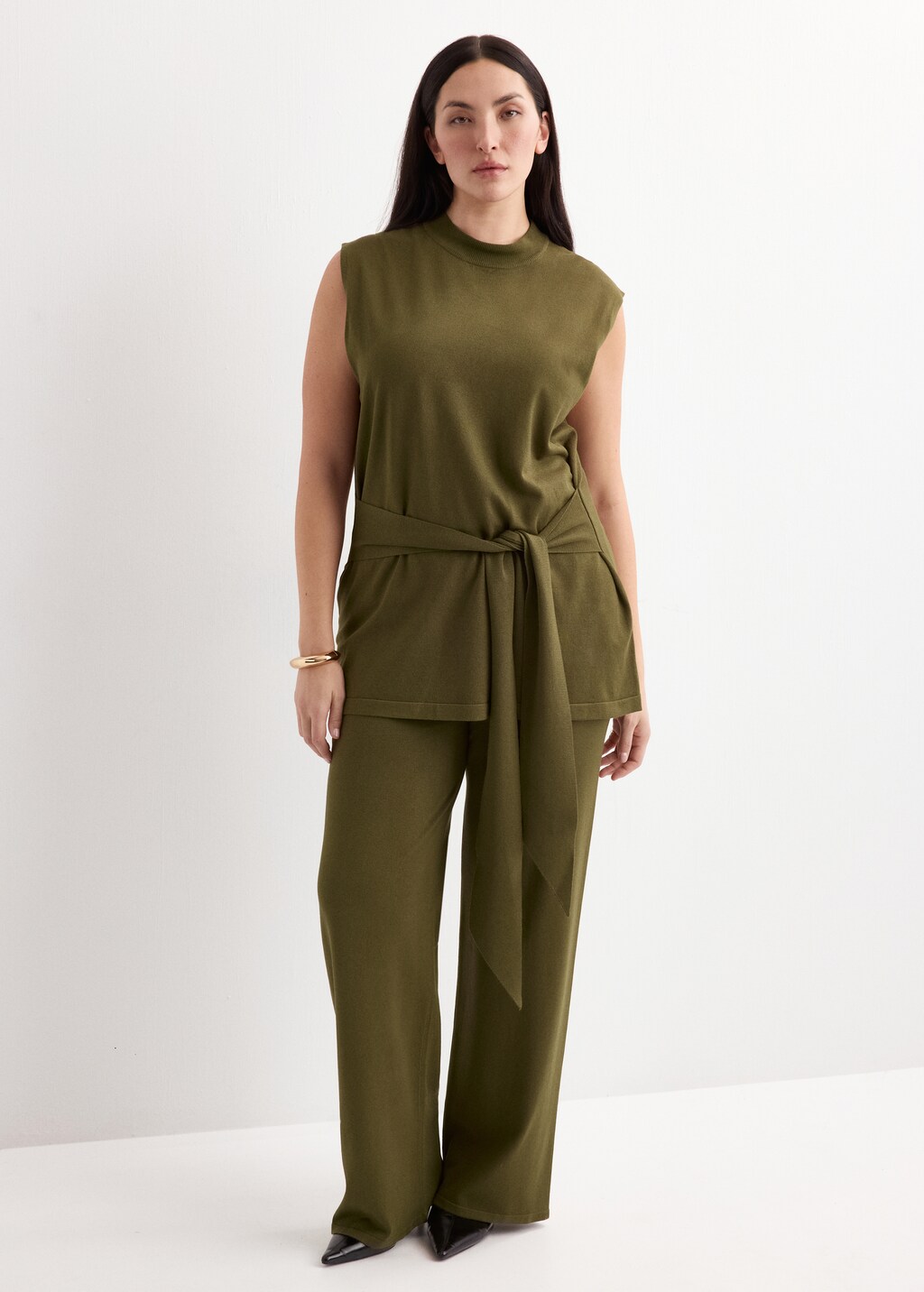 Maille fine. Coupe droite. Design long. Taille mi-haute. Taille élastiquée. Sans fermeture. Total look. Disponible Plus.