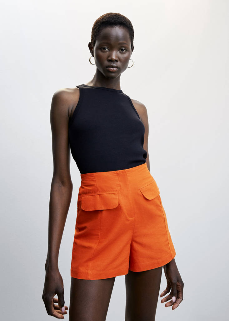 Tissu de coton mélangé. Tissu en lin mélangé. Tissu fluide. Coupe courte. Fermeture Éclair avec agrafe et bouton dissimulés. Poche à rabat sur le devant. Total look
